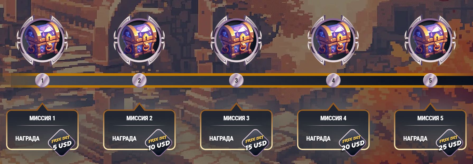 • 1 уровень — фрибет 5 USD.