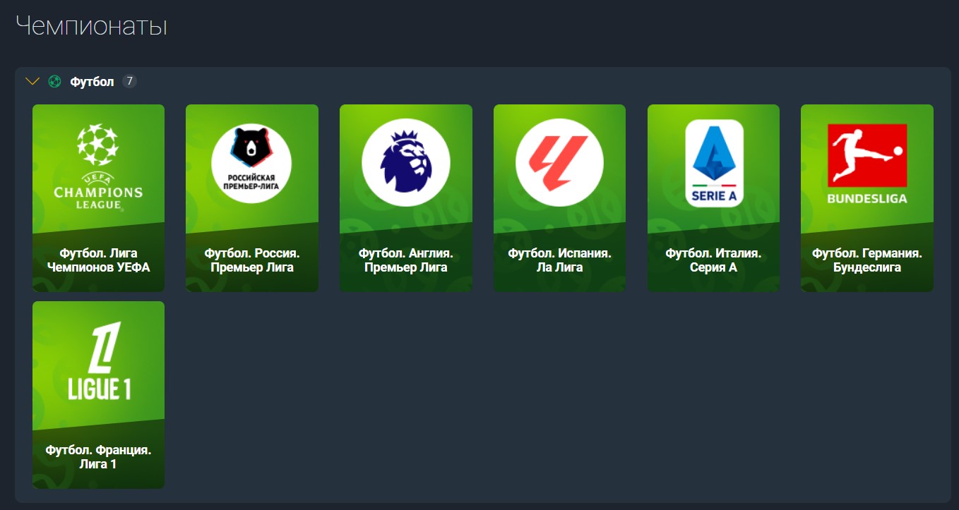 В линии более 25 видов спорта. Приоритет в росписи — соревнования на территории России. РПЛ, КХЛ, Единая лига ВТБ представлены шире, чем нишевые зарубежные турниры.