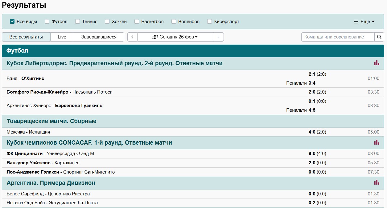 Матч-центр и полнотекстовый поиск по росписи в мобильном приложении недоступны — для этих функций используйте веб-версию сайта.