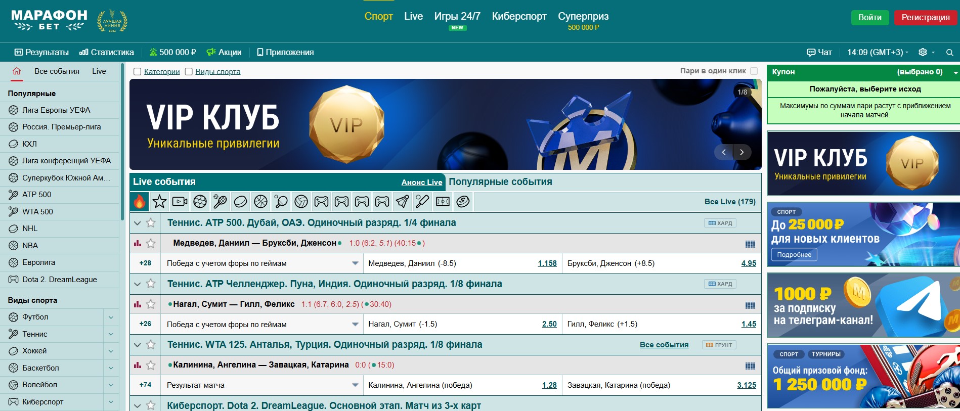 Марафон — один из немногих легальных букмекеров РФ, где прематч явно доминирует над лайвом как по росписи, так и по коэффициентам. В лайве линия скромнее: событий меньше, маржа выше. Зато прематч компенсирует с лихвой — свыше 30 видов спорта, глубокая роспись на нишевые турниры, маркеты, которых нет у других.